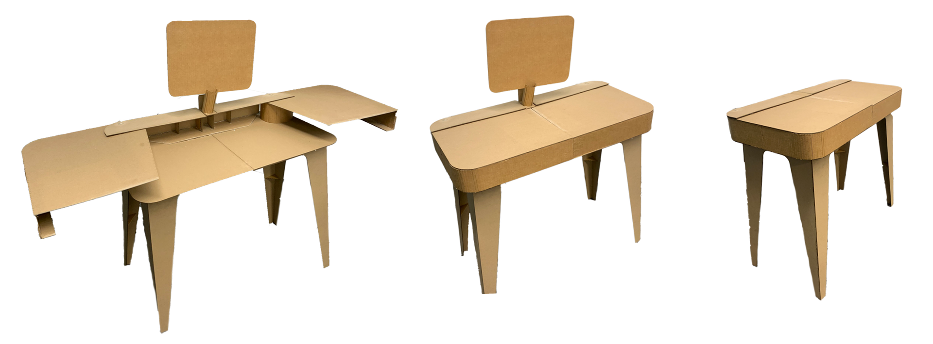 The outcome of our iterative process was a full-size, functional desk prototype with 3 distinct states—work, rest, and hidden. In the work state, the top level of the desk rotates outwards and provides the user with an additional 65% of space. In the rest state, the user can cover their work by rotating the top level inwards while still having access to the monitor.
