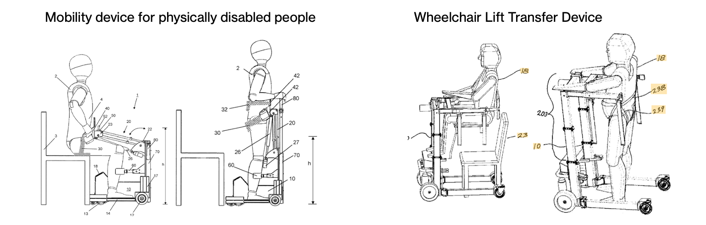 When exploring current mobility device patents, we found that the majority of claims focused on assistive standing rather than portability. Multiple patents relied on motorized mechanisms to raise the user into a standing position, shown above. While these designs effectively help the user stand, they eliminate the exercise element in between the two states.